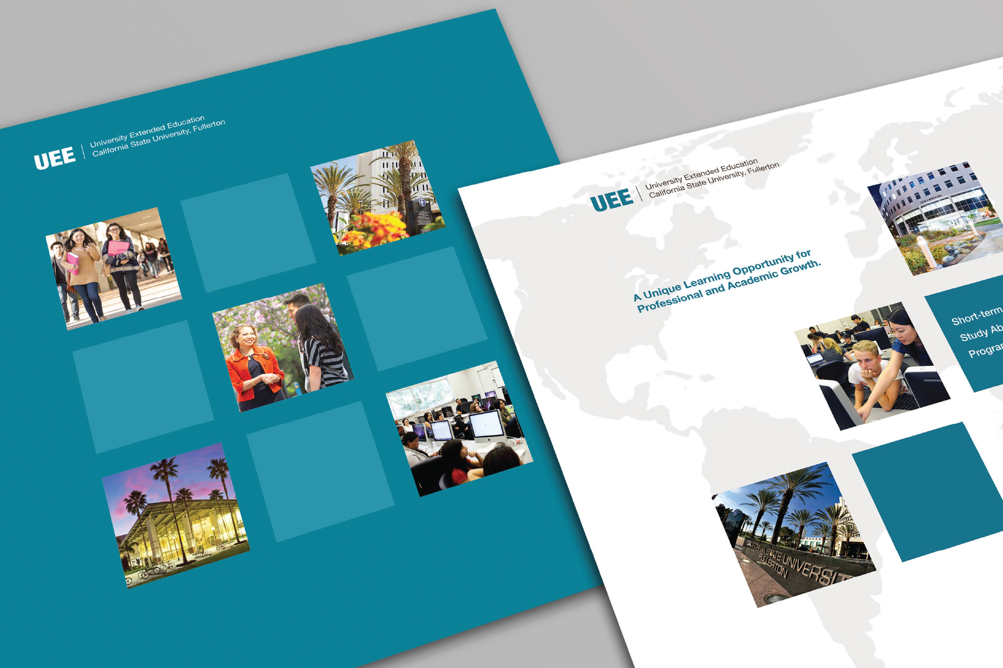 University Extended Education brochure for student study abroad programs. Two cultures One Design is an 11x17 poster to encourage students to take part in the Danish graphic design program. Denmark students spent two weeks at Cal State Fullerton, then CSUF students spent two weeks in Denmark. Agency: UEE, Cal State Fullerton