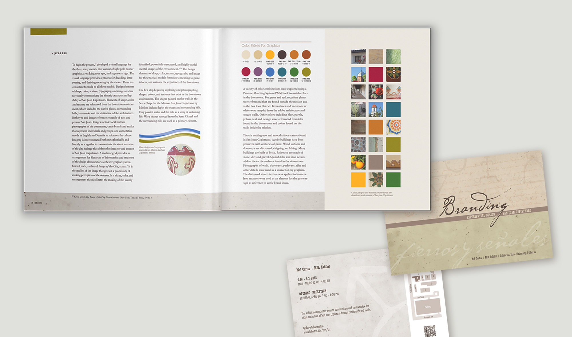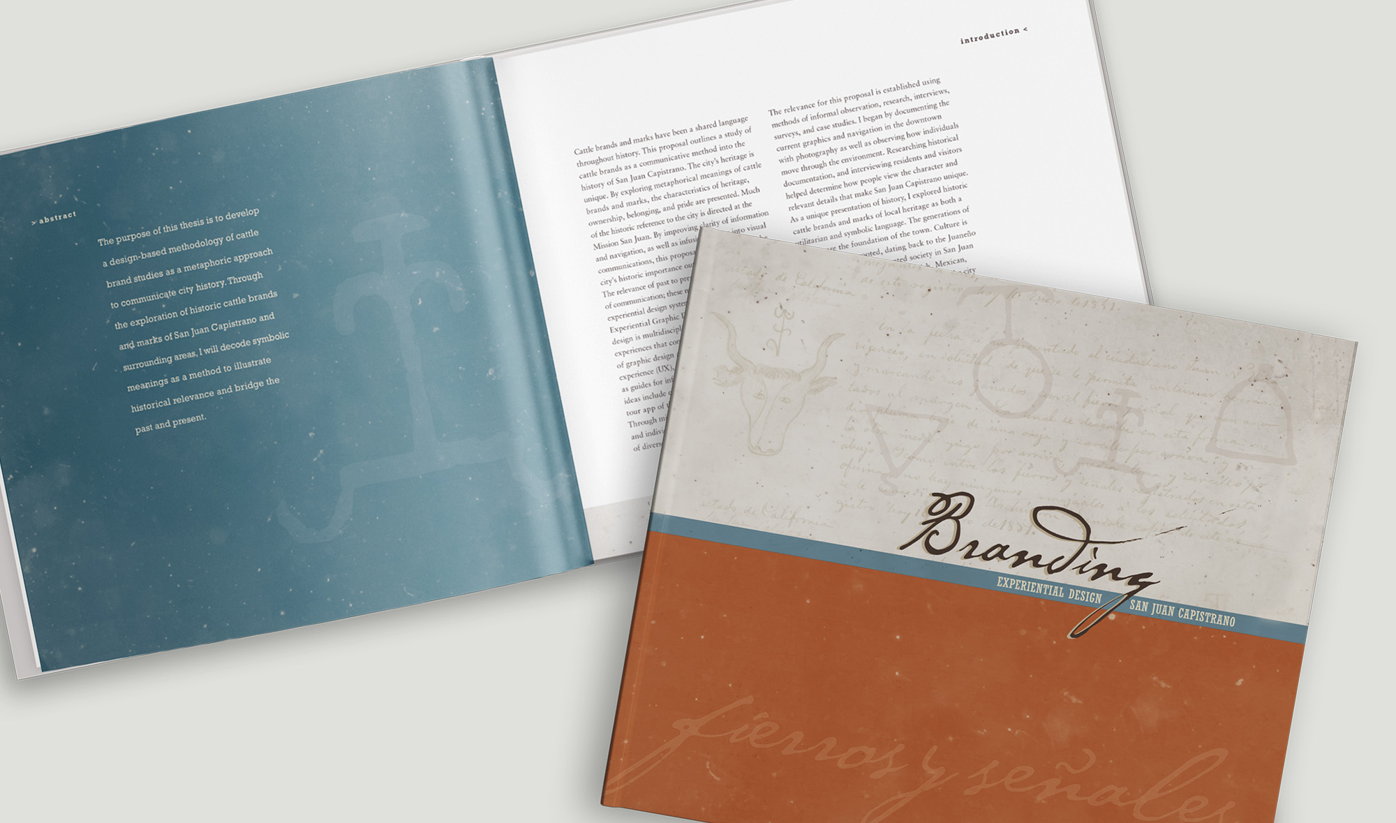 I wrote and designed this thesis study. The book explores historic cattlebrands and symbols and their relevance to the unique heritage and development of San Juan Capistrano, California. It diagrams the importance of history as a method for visual communications to the city brand. The postcard is for the thesis exhibit at Cal State Fullerton which demonstrated my research of brands and marks and visual tactics to communicate the city vision and character.